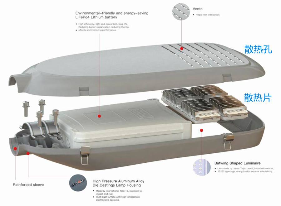 鴻泰太陽能路燈采用導熱性極佳的散熱片,內(nèi)腔空間大,熱交換面積大,帶走更多熱量。